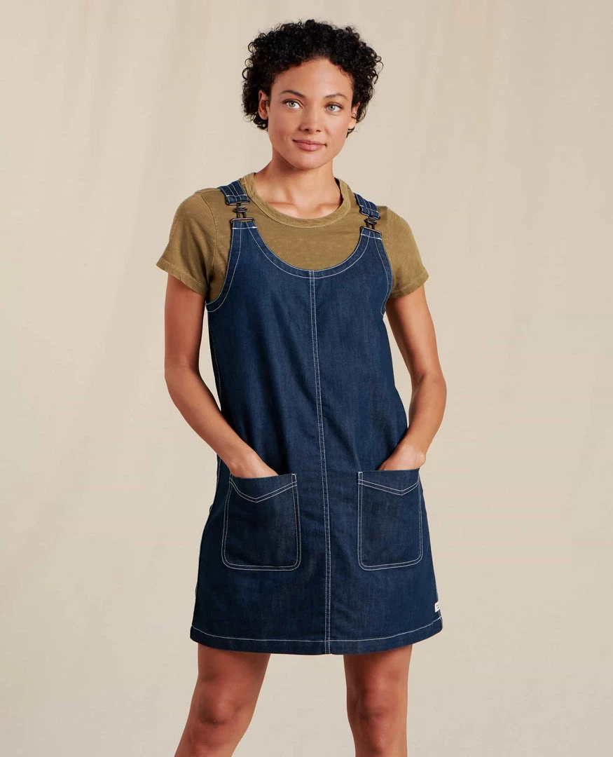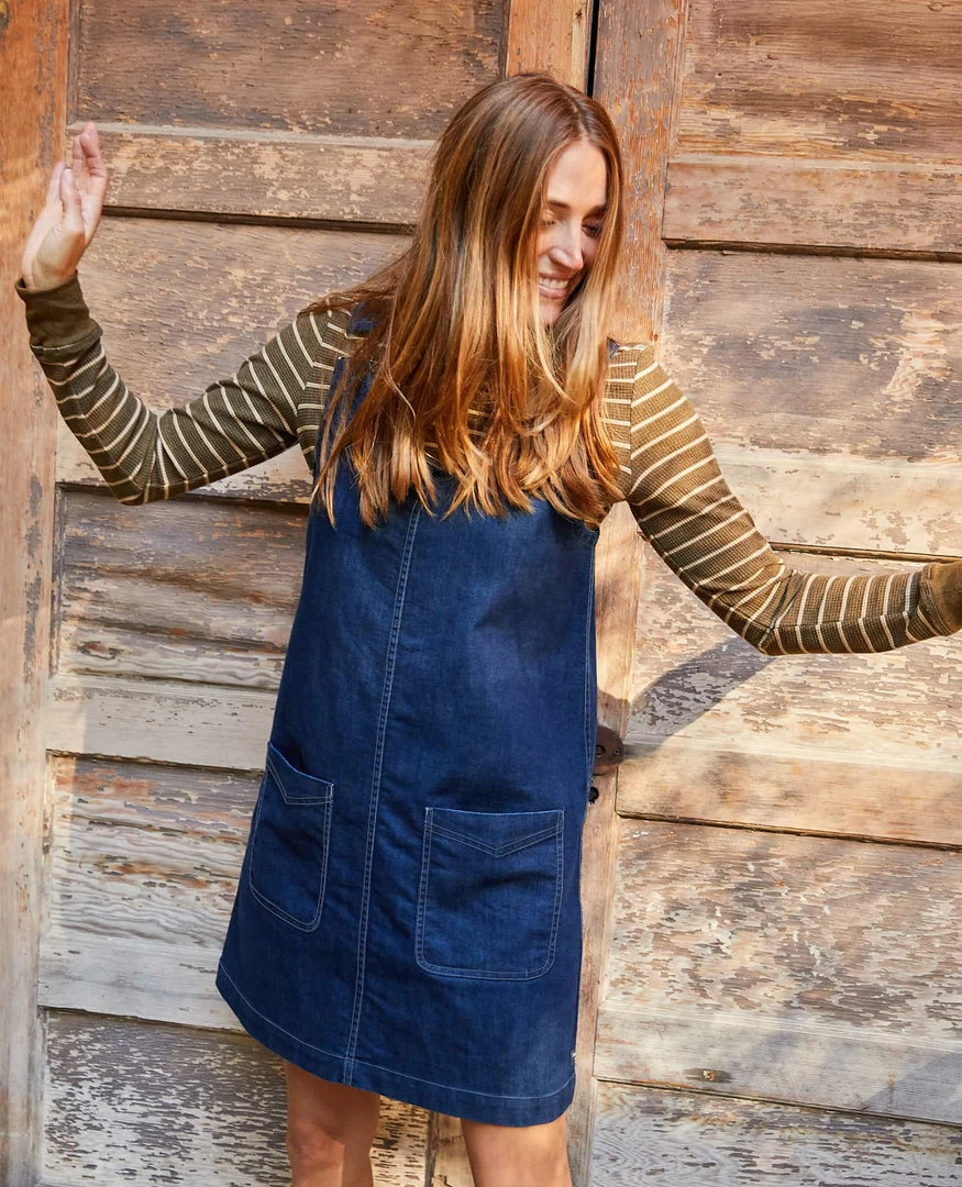 Fall means lush layers and vibrant textures teaming up to take on the day. Our denim jumper partners with everything from turtlenecks to tees and sweaters to henleys. Contrast stitching gives her some spice, but sweet drop-in pockets mean you can still take her home to bake cookies with mom.