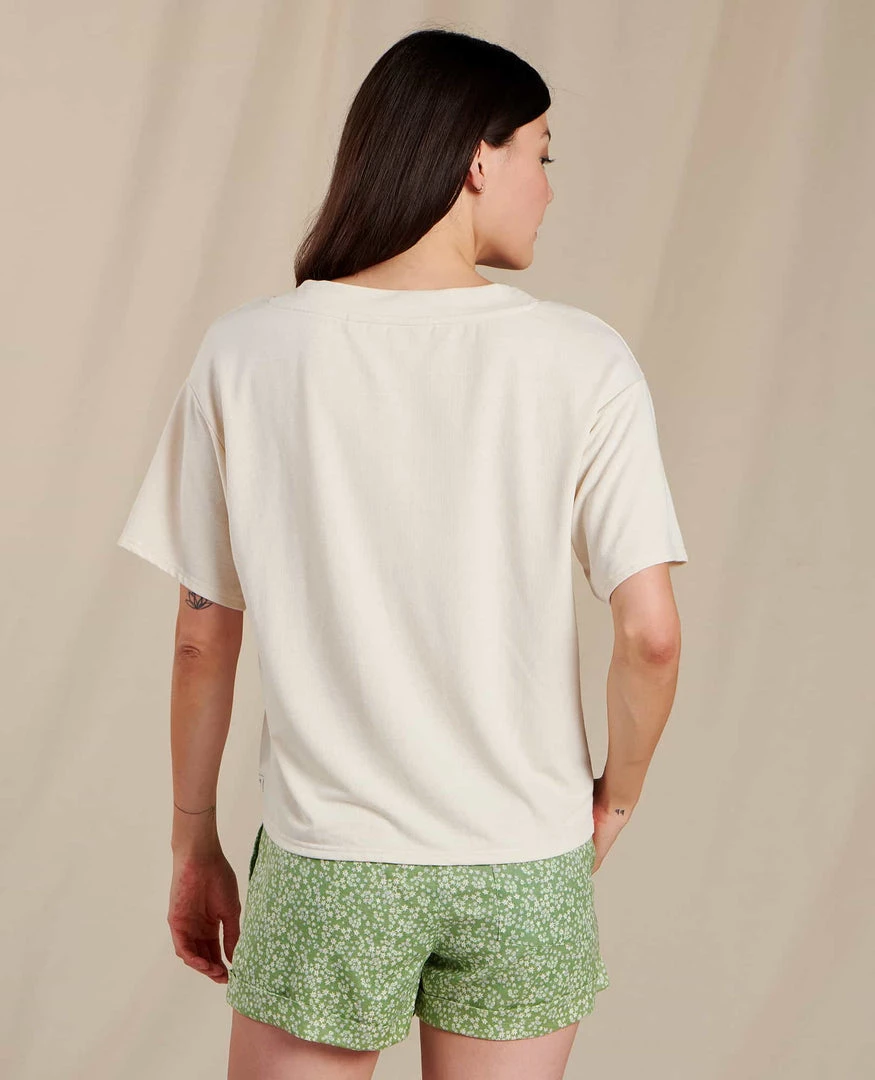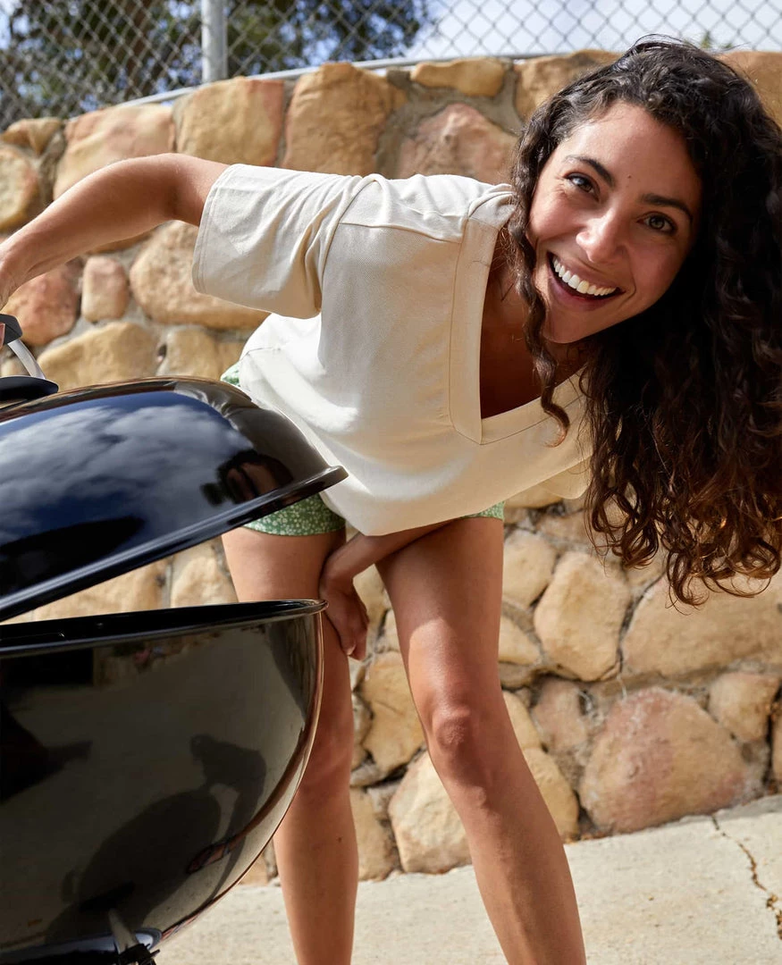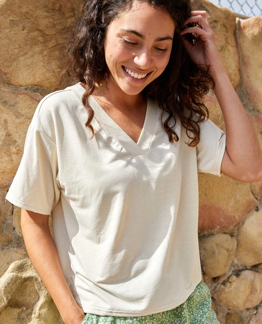 Mirror mirror on the wall, who’s the easiest basic of them all? A boxy, oversized fit gives this tee a retro vibe, but her recycled polyester/hemp fabric tells an eco-story that’s 100 percent now. A slight crop means she’ll tuck well into a skirt, or wear her over your best bike shorts for bummin’ around in style.