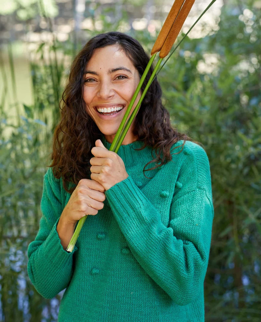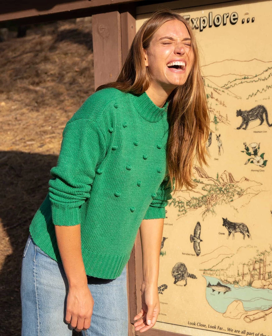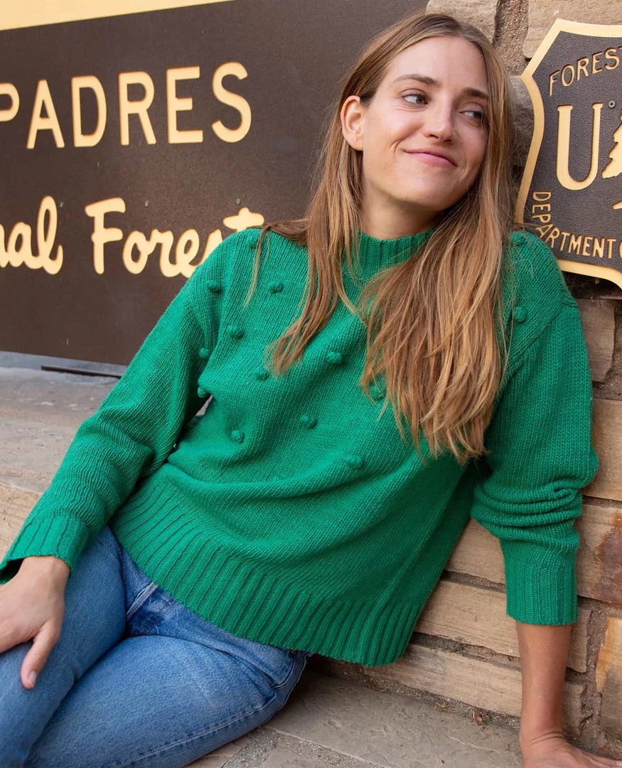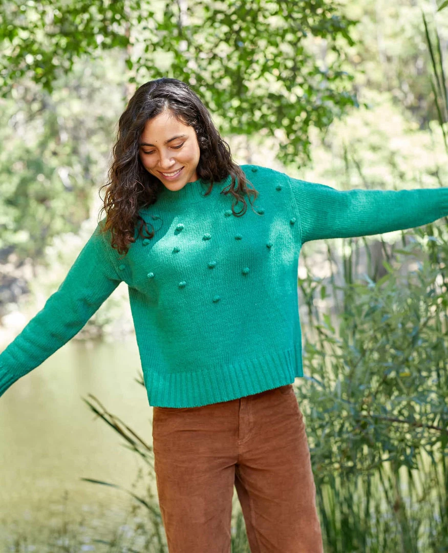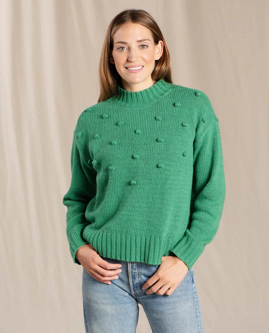 Pom-pom bobbles keep spirits high even as temps drop, and a low mock neck adds a dash of protection against Mother Nature’s moods. Made entirely with recycled fibers, so your conscience will feel good too.