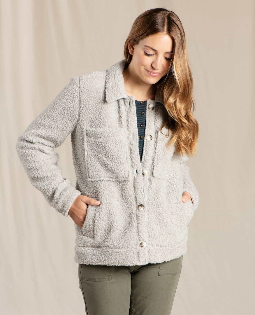 A love letter to the outdoor ‘fits of yore, this cozy sherpa fleece shirt jacket borrows all that was wild and wonderful from early adventuring, updated with a modern eye for eco-friendliness. Our old-school nubby fleece looks vintage—but it’s actually made from 100% recycled materials, including 70% recycled wool. Oversized chest pockets can hold your compass (or phone), while hand pockets help your mitts stay warm.